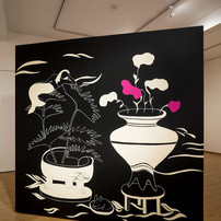 Yendo del dibujo hacia la pintura encuentro elementos que provienen de distintos lugares, tiempos y distancias; objetos populares, objetos cotidianos, cerámicas de distintas épocas, pintura argentina, naturaleza, ilustraciones, empapelados, arte oriental y mundos fantásticos.