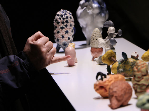 Cada curiosidad de este gabinete fabuloso –cada “bicho”, como su autora los llama con cariño– recibe de ella un mundo que habitar cuando nace. Una ficción de biosfera, donde la diferencia entre opacidad y brillo, o entre rugoso y liso, se resignifica como alternancia de superficies secas o mojadas. Allí cada ser dispone de un hábitat o teatro en miniatura; un planeta propio en el que desplegar su personalidad. Criaturas de su imaginación, y sin embargo, muy tangibles, estas figuras más allá de todo género o especie permiten imaginar lo vivo por el camino de los sueños y la fantasía.