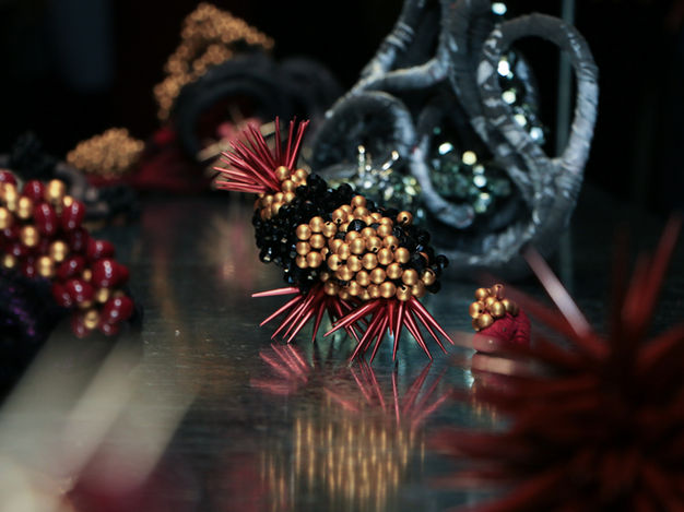 Algunas piezas remiten a armaduras, a capullos o a caparazones de defensa; estas abordan la metamorfosis del objeto funcional. Otras a un paisaje de protuberancias que descansan sobre un soporte cuasi quirúrgico. Cada una de ellas puede leerse y usarse de distintas formas y todas revelan en si mismas la versatilidad potencial entre obra y objeto, obra y vestimenta, obra y armadura, obra y accesorios.